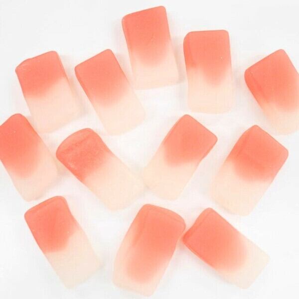 ■原材料:水あめ(国内製造)、砂糖、ゼラチン、粉末オブラート、ストロベリー濃縮果汁、植物性乳酸菌(殺菌)、デキストリン/ソルビトール、酸味料、光沢剤、香料、着色料(酸化チタン、赤102)、乳化剤、(一部にゼラチンを含む)