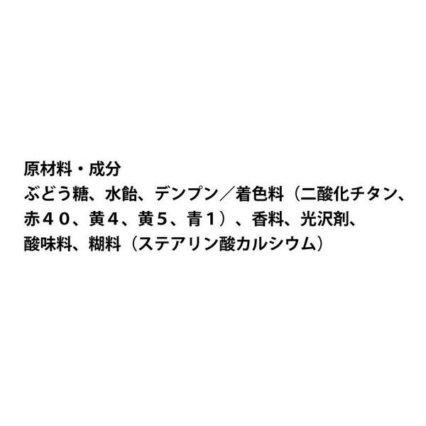 ■原材料:ぶどう糖、水飴、デンプン/着色料(二酸化チタン、赤40、黄4、黄5、青1)、香料、光沢剤、酸味料、糊料(ステアリン酸カルシウム)